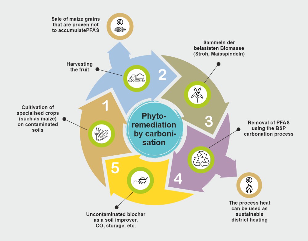 The approach pursued by Live Energies GmbH for long-term decontamination is to cultivate the affected soils with suitable plants and then carbonise the resultant contaminated biomass. In doing so, the problematic compounds can be broken down, while producing bio-char and process heat from a regenerative source at the same time.