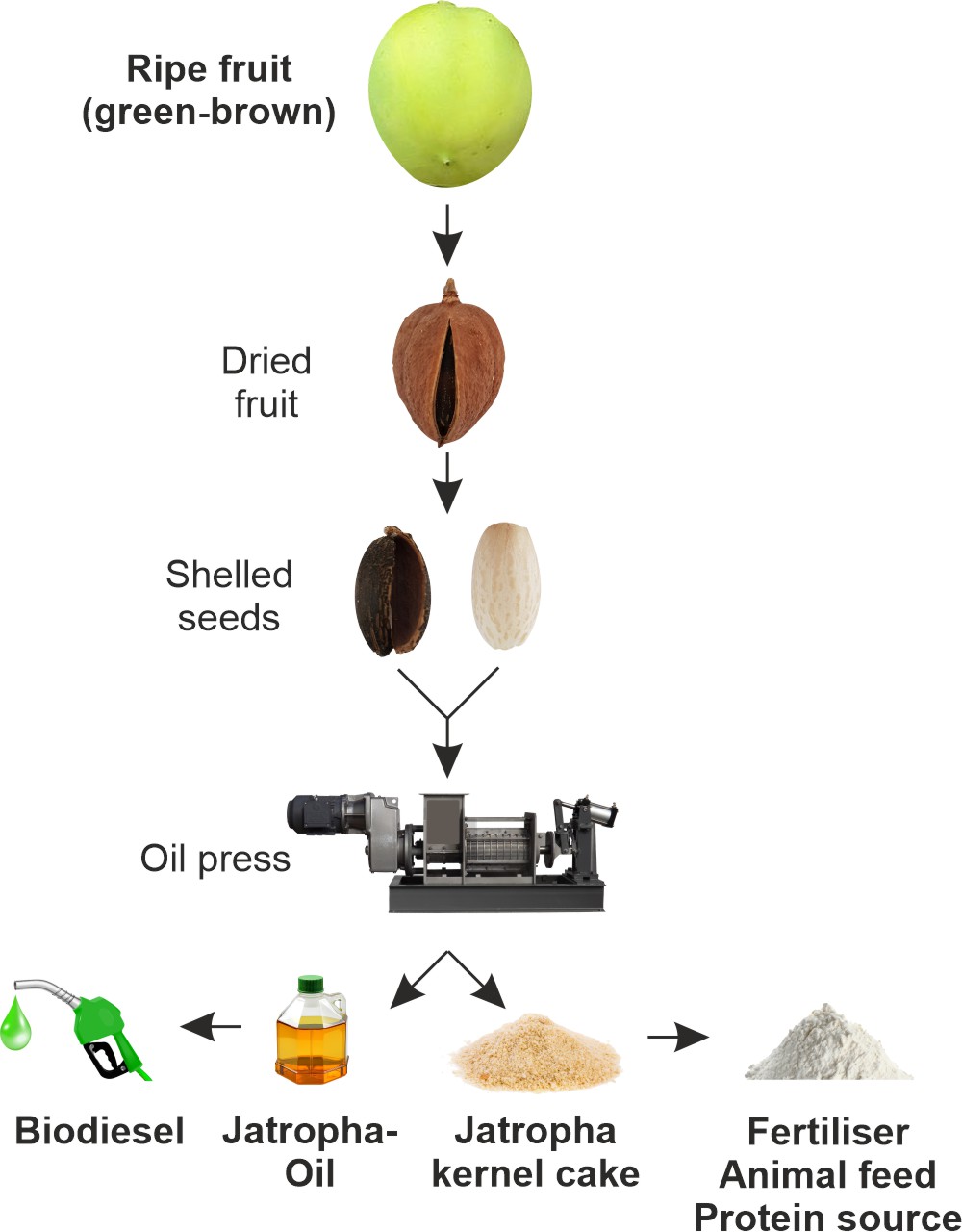 Due to its excellent physical and chemical properties, Jatropha oil has high potential for fuel production. It can be used as a pure plant-oil fuel in modified engines, as a feedstock for biodiesel (according to European and ASTM standards), sustainable aviation fuel (SAF) and for the production of hydrotreated vegetable oil (HVO), which is also referred to as renewable diesel.
