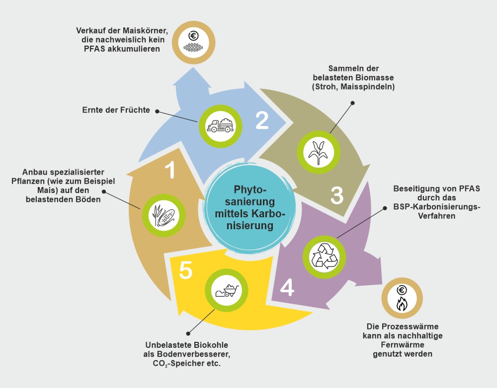 Der von der Live Energies GmbH verfolgte Ansatz zur langfristigen Dekontamination ist, die betroffenen Böden mit geeigneten Pflanzen zu bewirtschaften und die anfallende belastete Biomasse zu karbonisieren. Hierbei können die problematischen Verbindungen abgebaut werden und gleichzeitig Biokohle und Prozesswärme aus einer regenerativen Quelle produziert werden.
